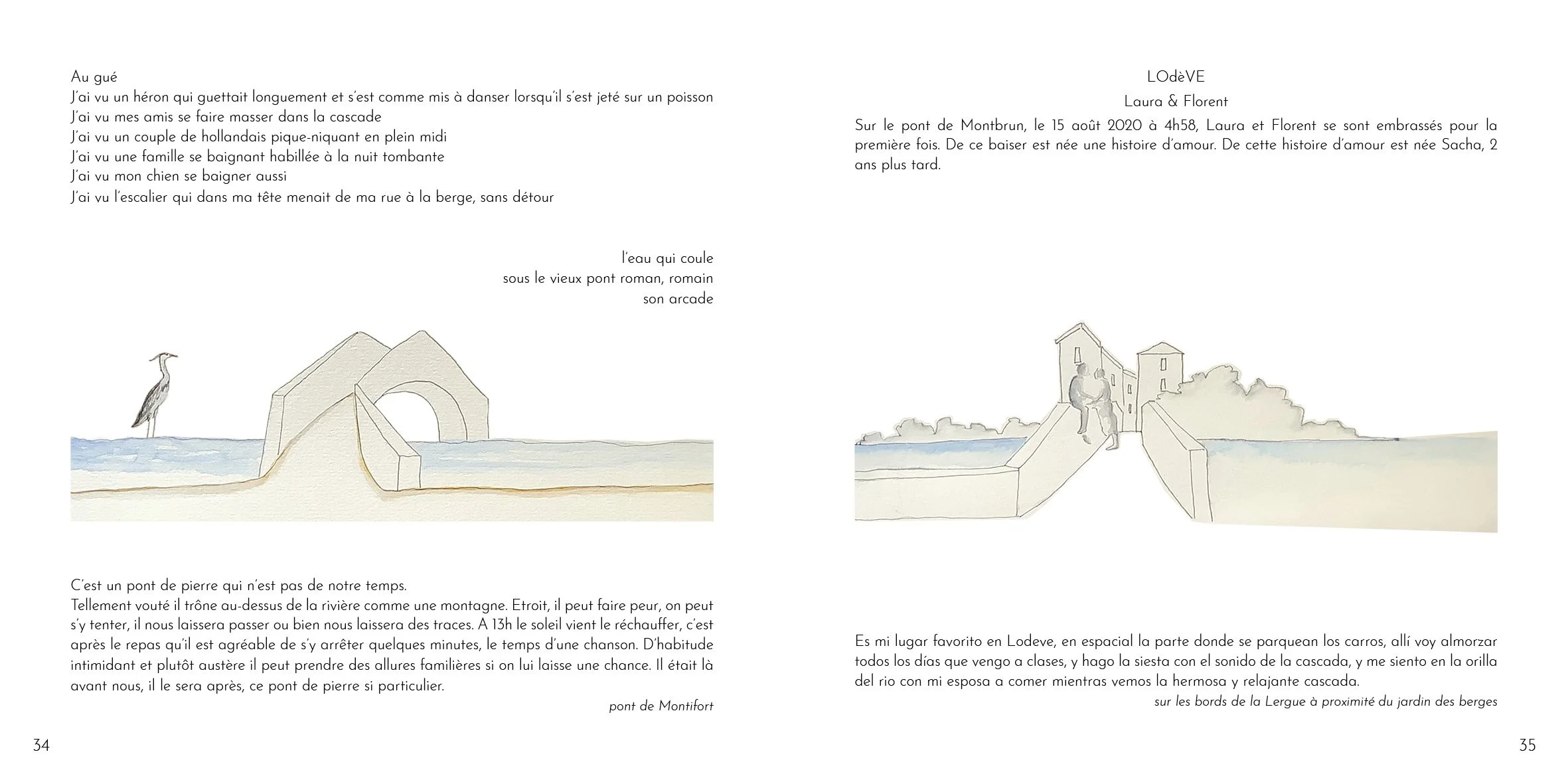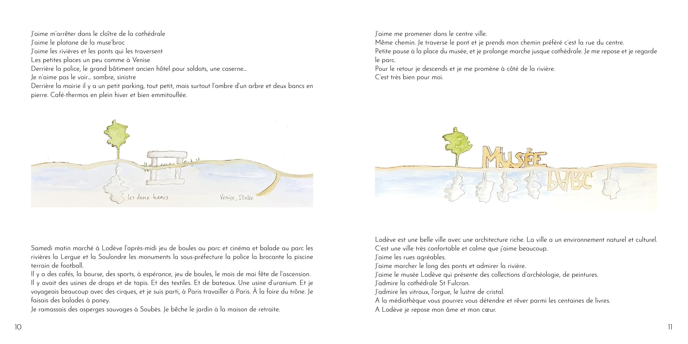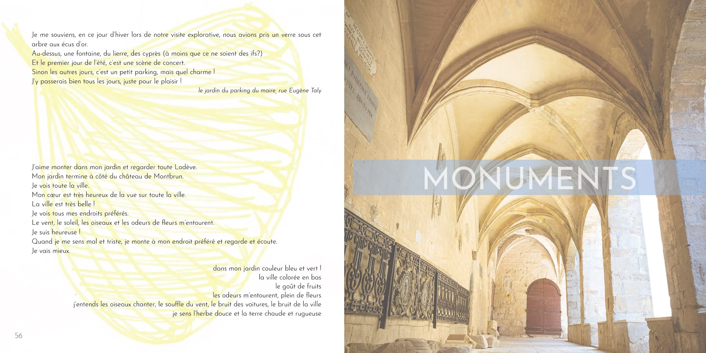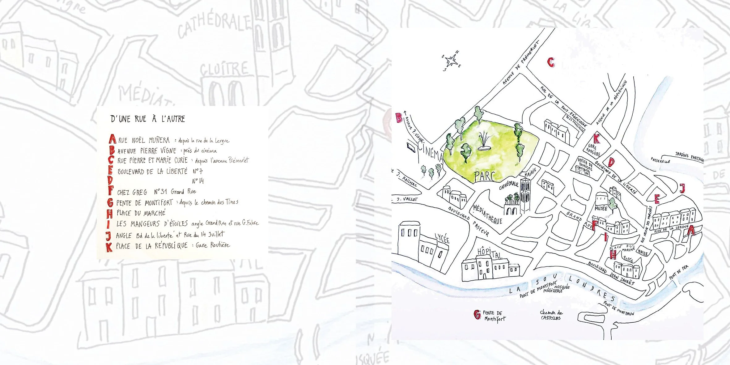 Une dizaine d'ateliers d'écriture menés dans différentes structures et une boite à textes installée au cœur de la ville, ont permis de recueillir les mots de celles et ceux qui y vivent, s'y promènent, y travaillent, la traversent... afin de dessiner une carte sensible de Lodève et témoigner du lien des habitantes et habitants avec des lieux de l'espace public.